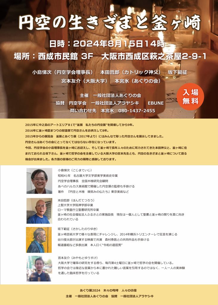 小島悌次(円空学会理事長) 本田哲郎(カトリック神父) 坂下範征 宮本友介(大阪大学) 本宮氷(あぐりの会)