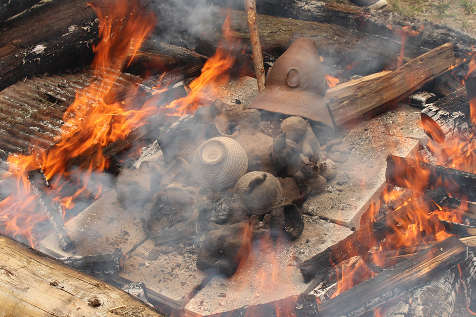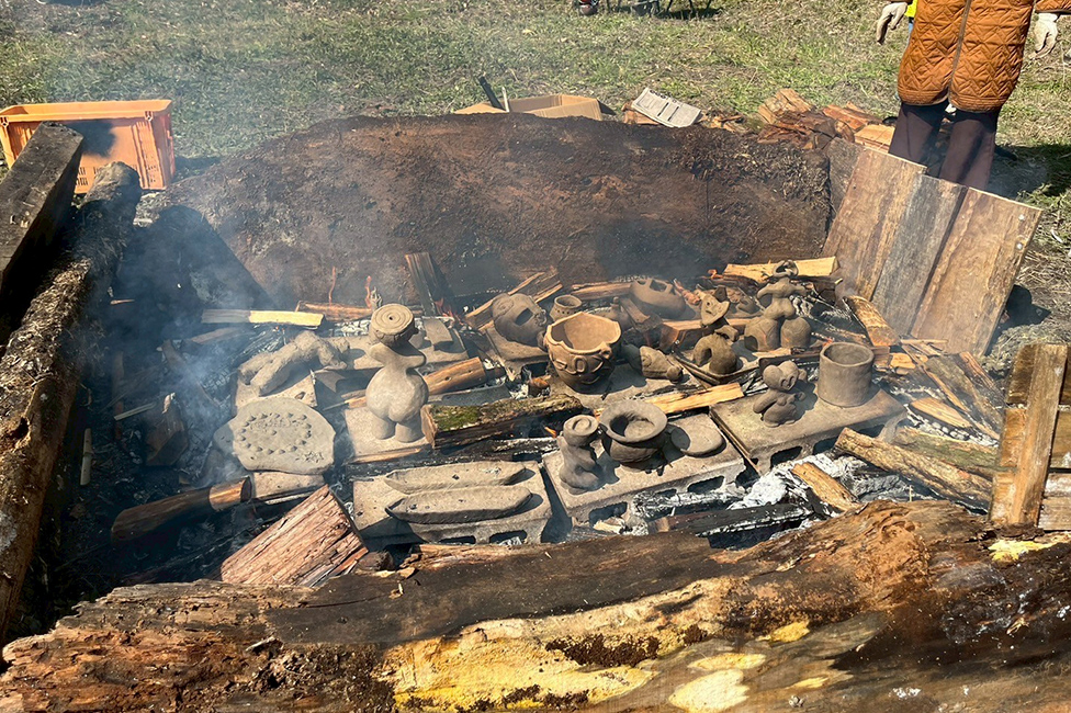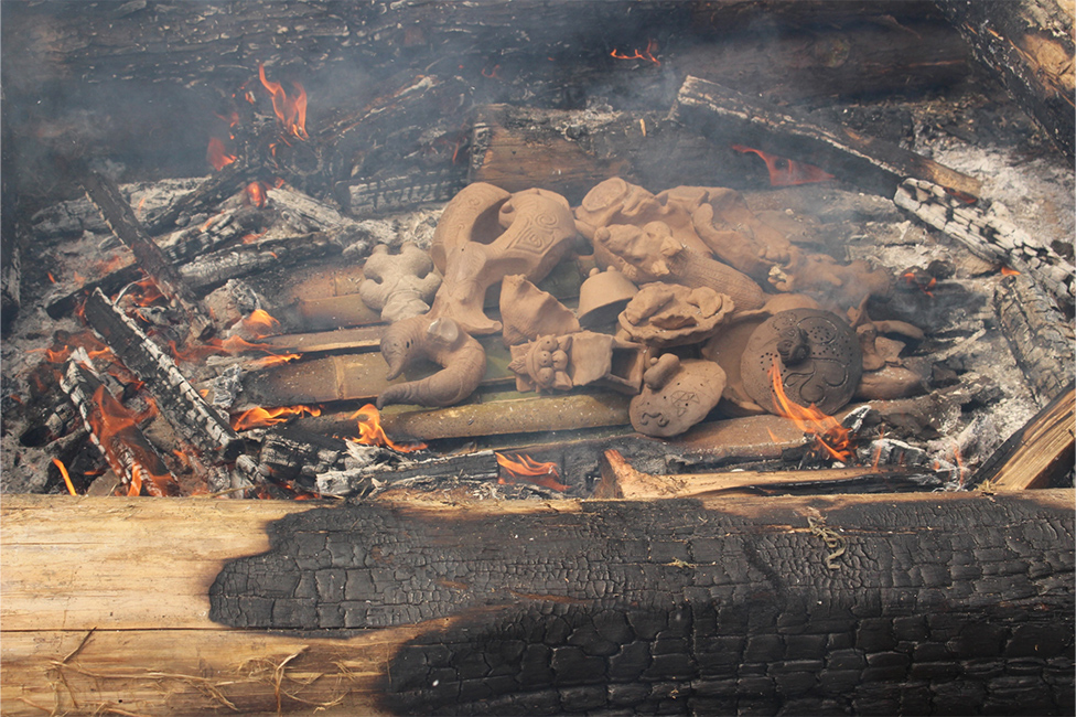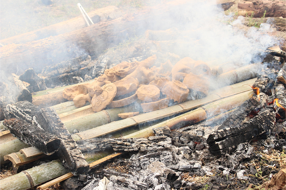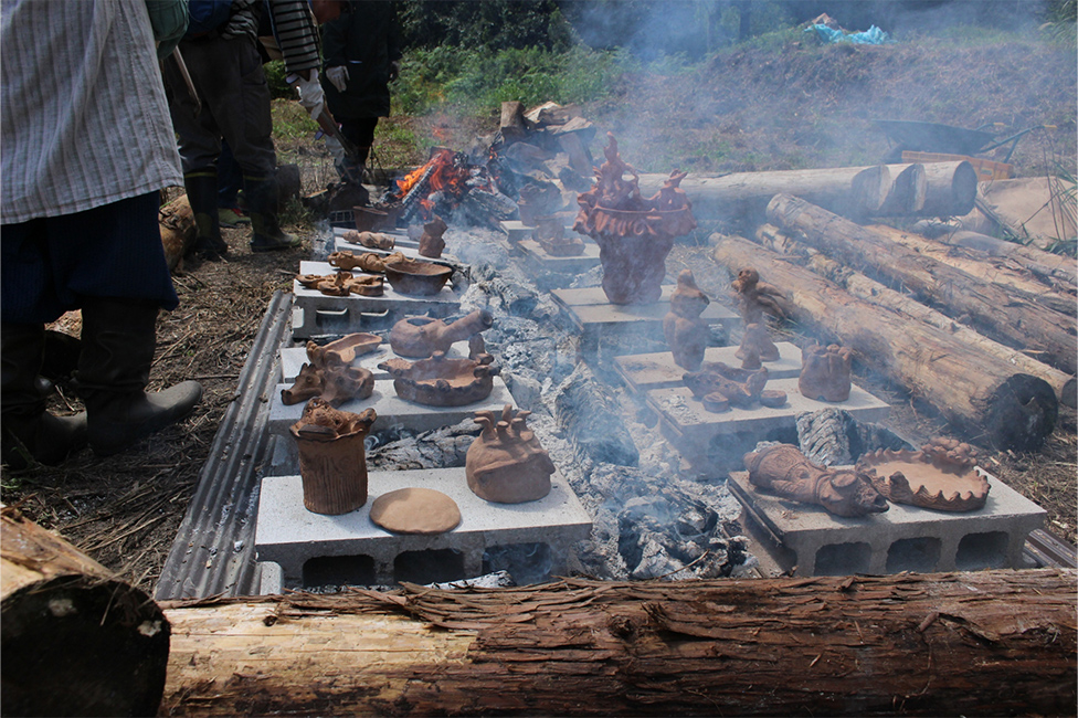 現代のような窯を使わず、野外で直接火を起こして土器を焼き制作していました。