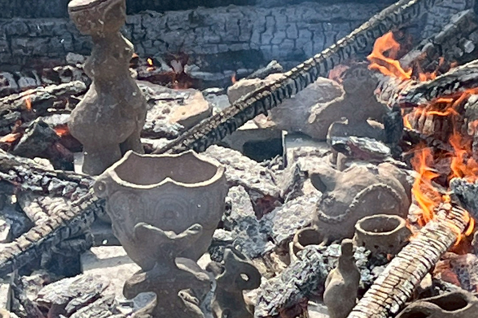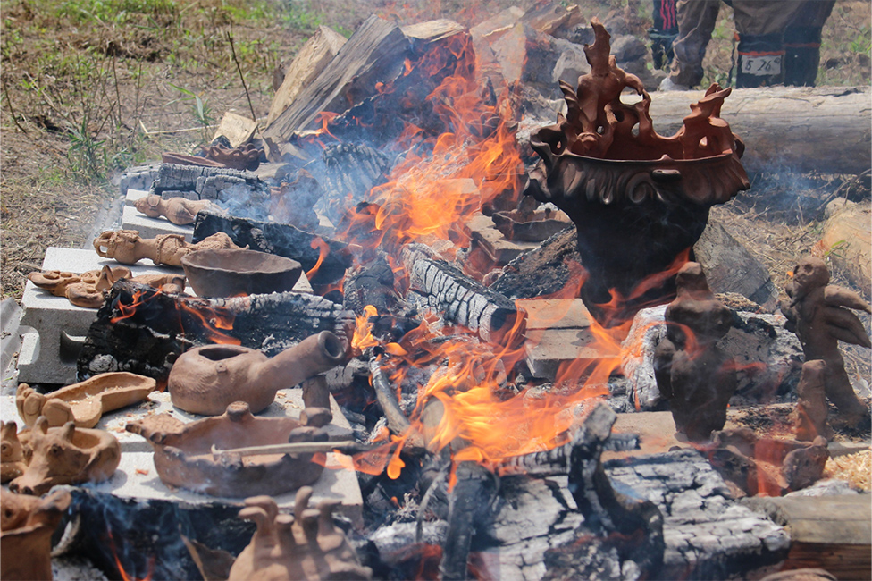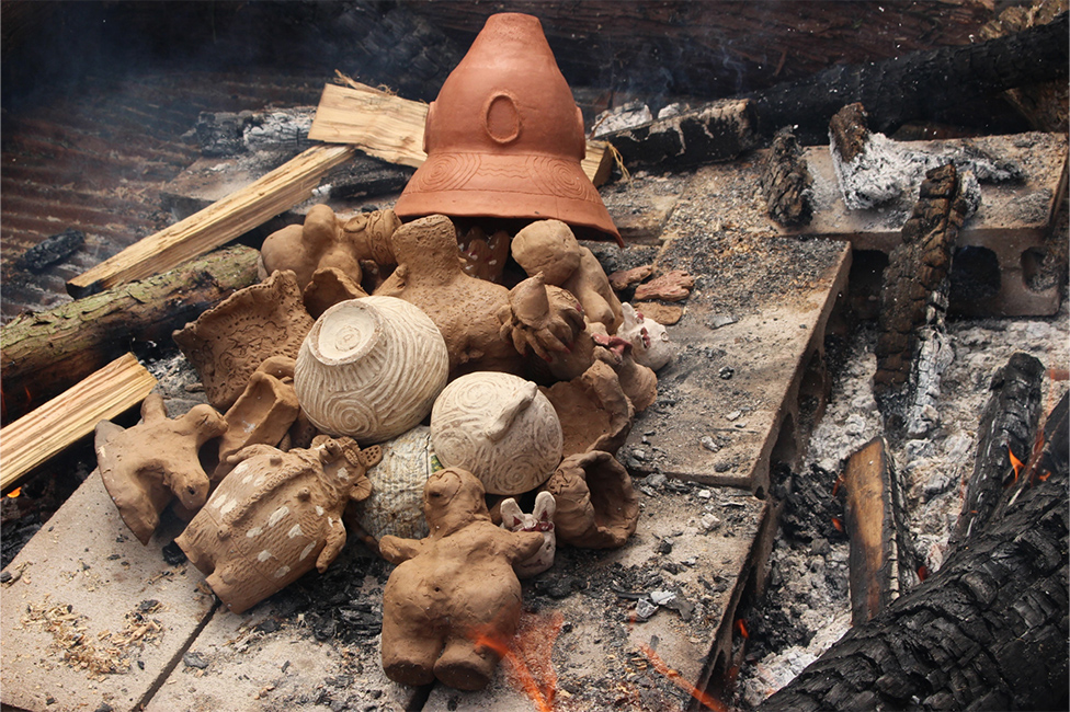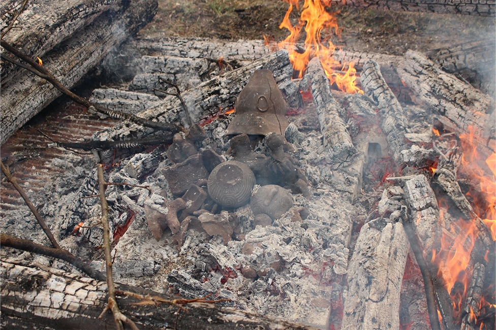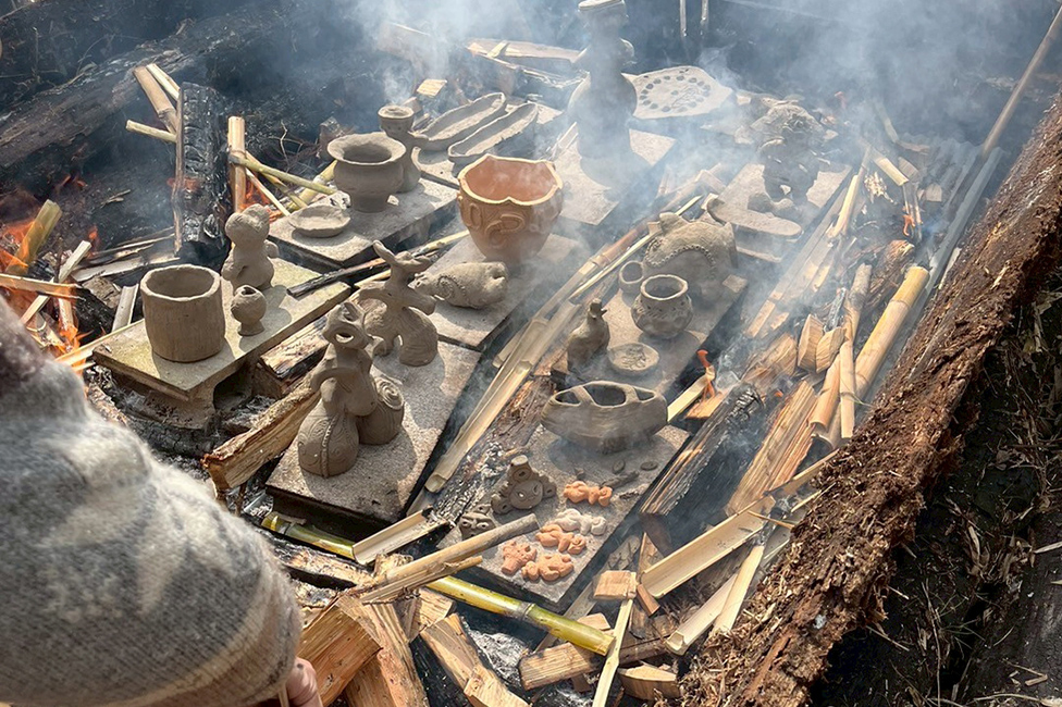 現代のような窯を使わず、野外で直接火を起こして土器を焼き制作していました。